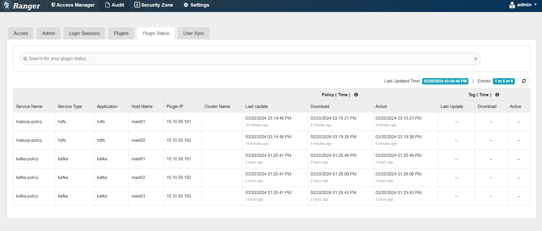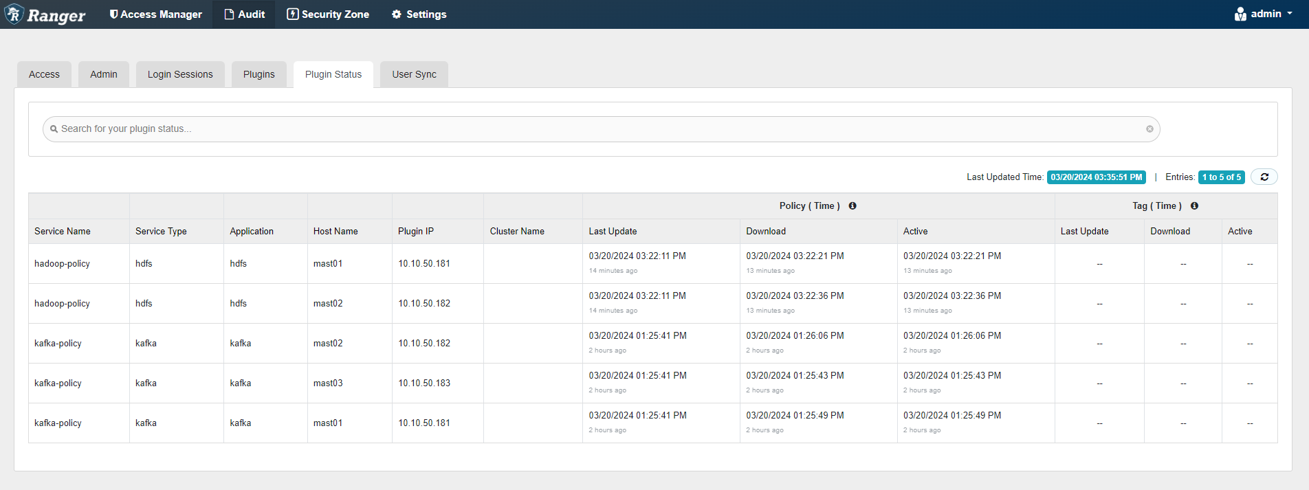 mast02:6080 (ranger UI) 내 Audit -> Plugin Status에 플러그인이 연동되었는지 확인합니다.