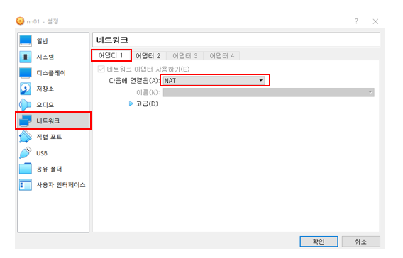 후 네트워크 클릭 - 어댑터1에 디폴트로 NAT 어댑터가 등록되어있음을 확인