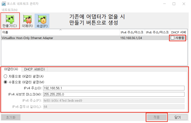 IPv4 주소에 위 명령 프롬포트 창의 VirtualBox Host-Only Network 주소를 입력