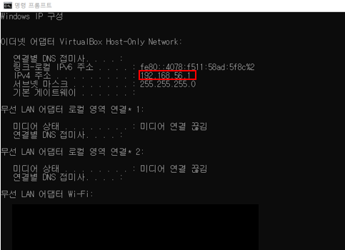윈도우 탐색기 – cmd – ipconfig 입력 – VirtualBox Host-Only Network 주소 확인