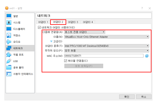 Virtual box 네트워크 어댑터 설정 방법: