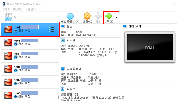 (서버 이름(nn01)옆 네모 박스는 회사 업무 중 복구를 위한 스냅샷, 본 가이드와는 무관하여 가림 처리, 초기 설치 시 없어도 그대로 진행)