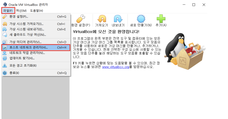 가상 머신(Virtual Box) 실행 및 호스트 네트워크 관리자 설정