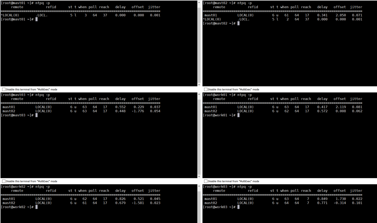 mast01~03, work01~03의 6대의 서버가 있고, mast01,mast02가 ntp 메인입니다.