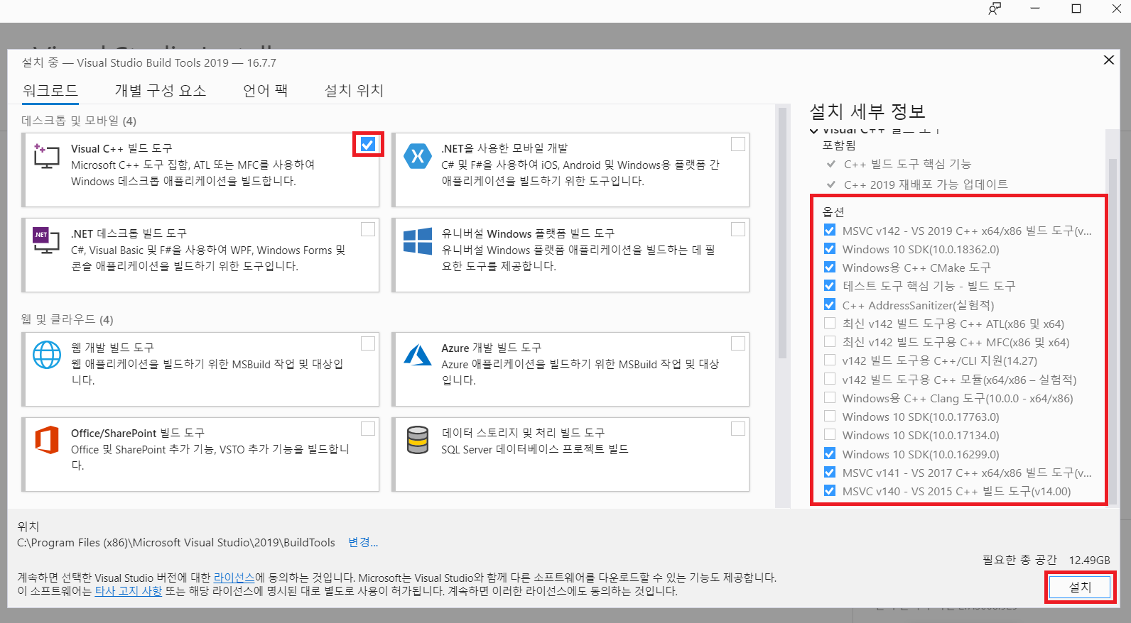 Visual C++ 빌드 도구 오른편 박스에 체크해주시면 설치 세부 정보가 오른쪽에 나타납니다.