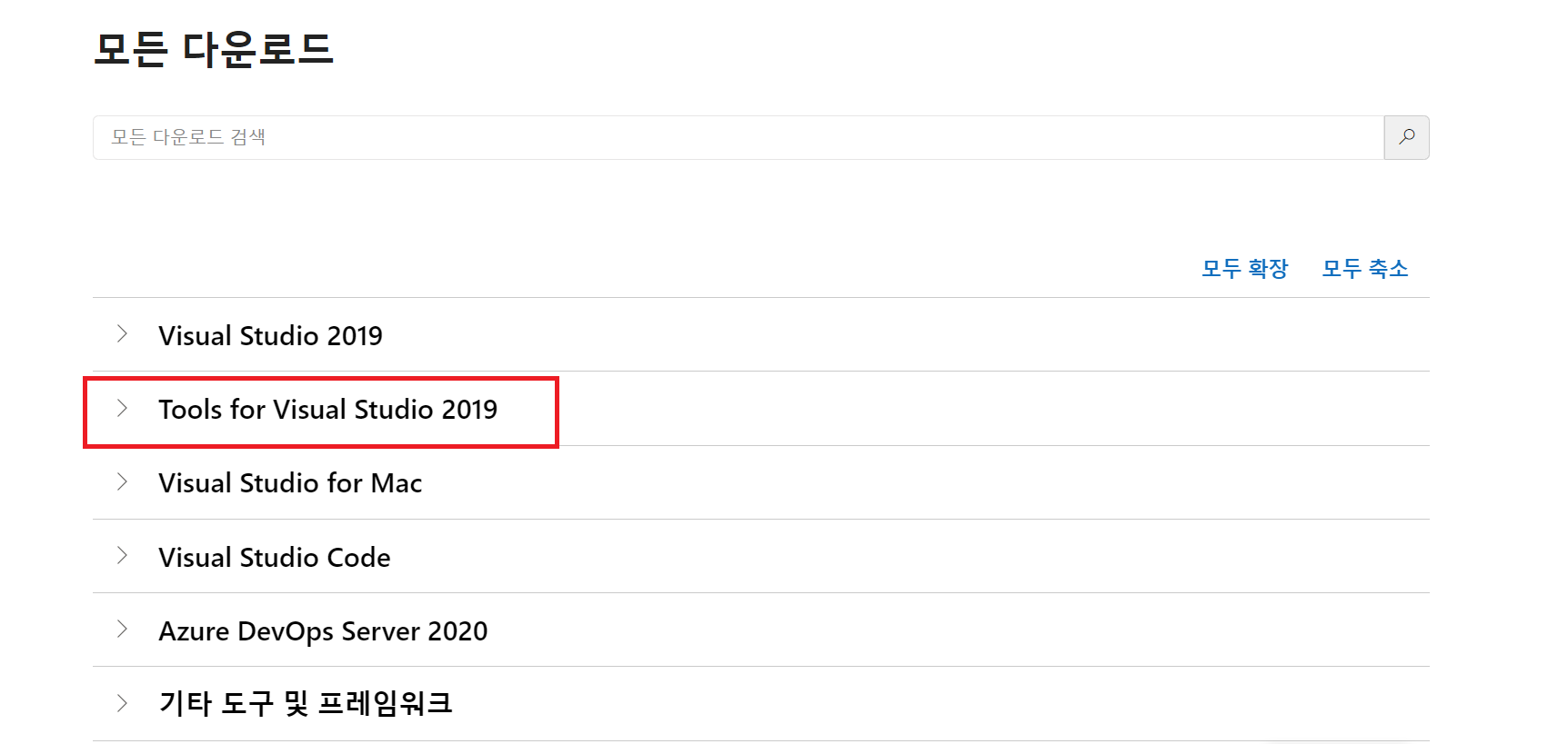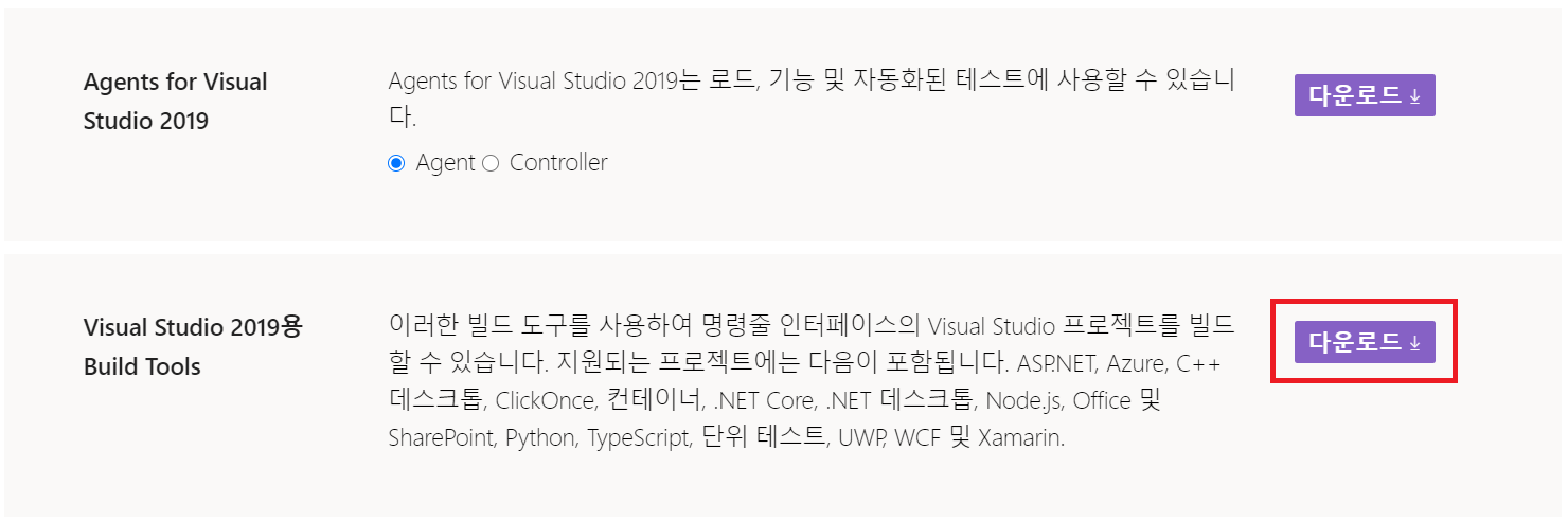 클릭 후 맨 아래에 있는 Visual Studio 2019용 Build Tools를 다운로드 해줍니다!