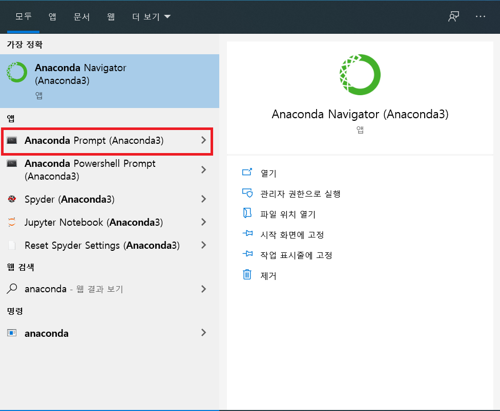윈도우 탐색창에 anaconda 입력 후 Anaconda Prompt (Anaconda3) 실행!
