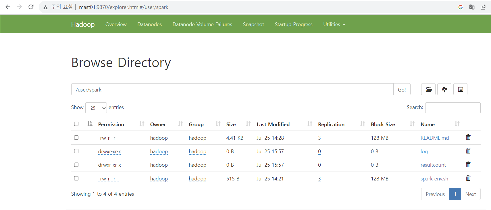 # hdfs://NNHA/user/spark/README.md를 워드카운트하여