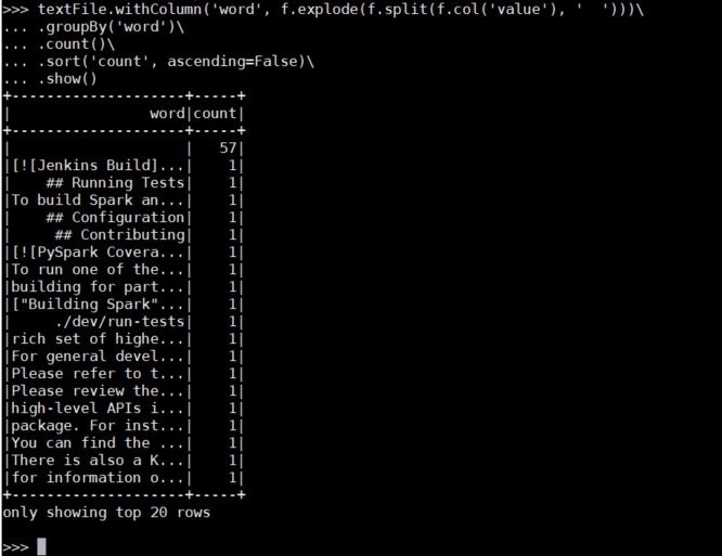 textFile.withColumn('word', f.explode(f.split(f.col('value'), ' ')))\