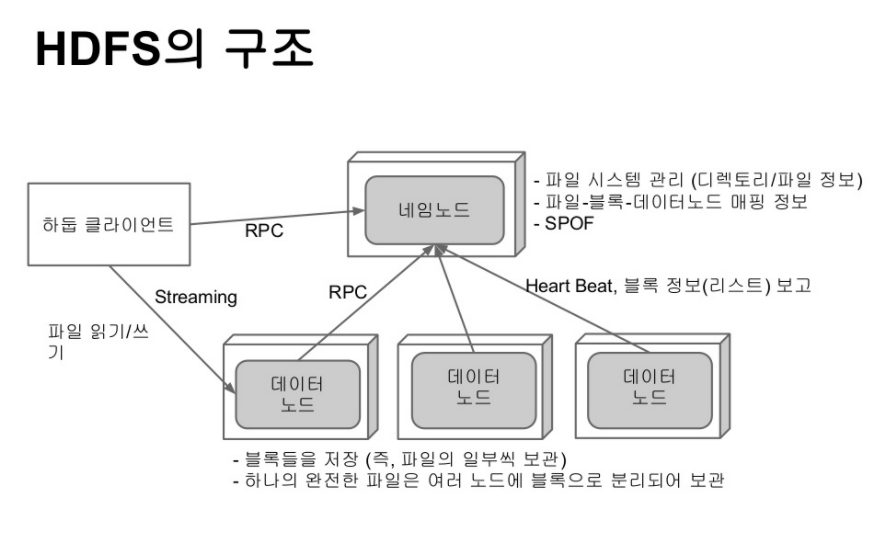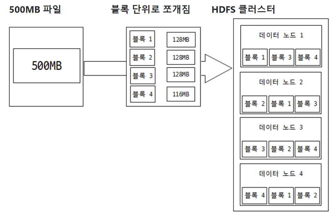 | 데이터 노드 (Data Node) | - 파일 시스템의 실질적인 일꾼 - 클라이언트나 네임노드의 요청이 있을 시, 블록을 저장, 탐색하며 저장하고 있는 블록의 목록을 주기적으로 네임노드에 보고 |