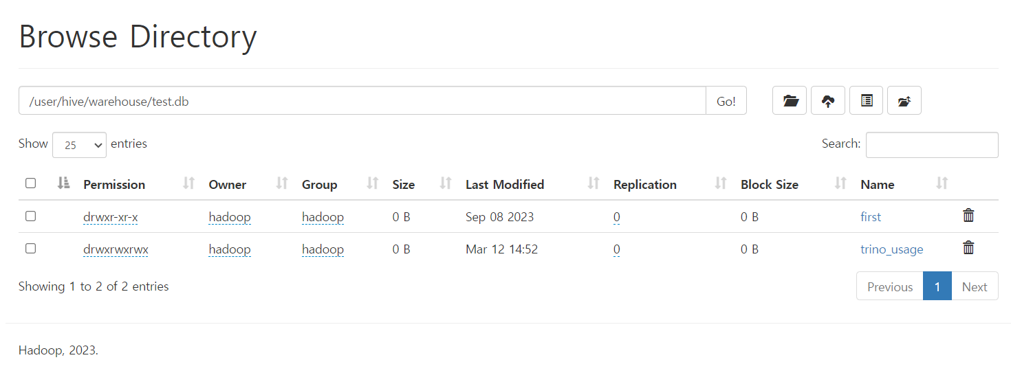 HDFS UI상에서도 테이블이 잘 만들어진것을 확인하였습니다.