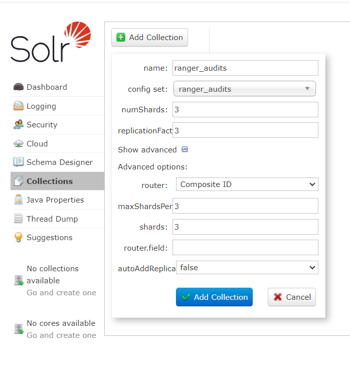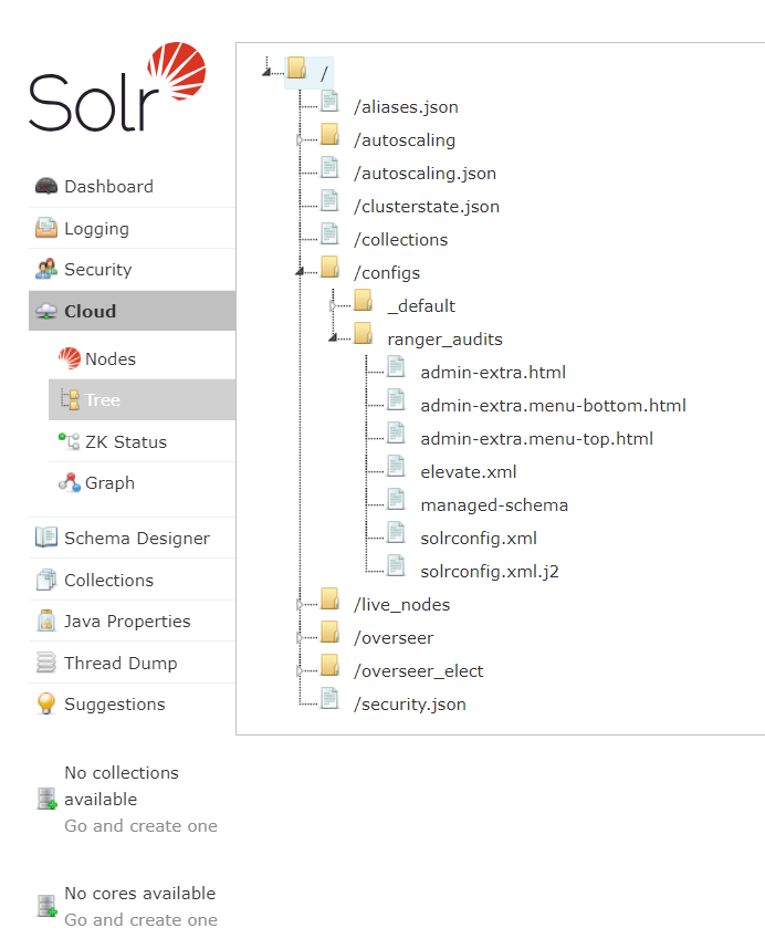 * 이 znode에 ranger가 사용할 solr 컬렉션의 config파일을 올리고, solr ui내에서 컬렉션을 생성하겠습니다.